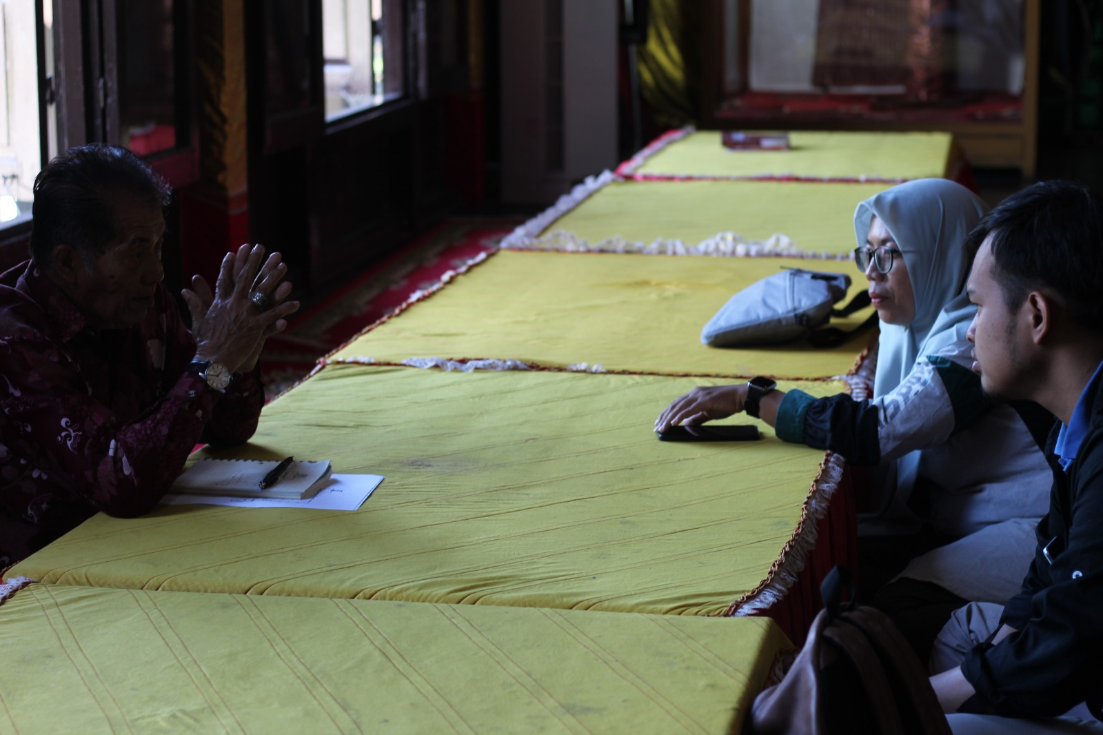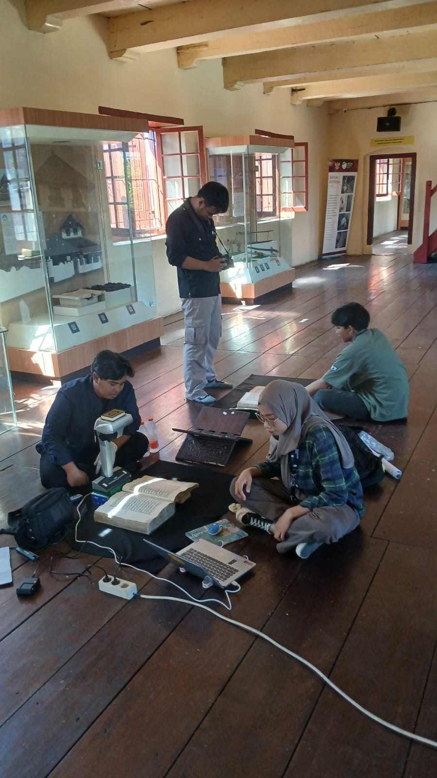 Tidak lama kemudian, kami didampingi oleh kurator museum, Pak Ardi, yang dengan penuh keramahan mengajak kami melihat langsung koleksi mushaf yang tersimpan. Terdapat tiga mushaf yang menjadi koleksi utama di museum ini. Meskipun tidak ditemukan parateks seperti mushaf di Balla Lompoa, mushaf-mushaf ini tetap menarik karena di dalamnya terdapat kode-kode hukum tajwid yang berfungsi sebagai penuntun bagi para pembaca. Digitalisasi mushaf dilakukan dengan hati-hati, dibantu oleh Pak Ardi serta mahasiswa Program Studi Pariwisata Universitas Hasanuddin yang tengah magang di museum. Proses ini selesai sekitar pukul 17.15 WITA.