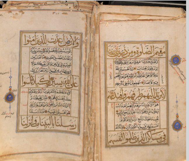 Salah satu keistimewaan mushaf ini terletak pada penggunaan tinta yang beragam dan penuh estetika. Tulisan ayat-ayat Al-Qur’an ditorehkan dengan tinta emas yang mencolok, memberikan kesan sakral dan bernilai tinggi terhadap teks. Tinta hitam digunakan sebagai tinta utama untuk teks, sedangkan tinta merah berfungsi untuk menandai waqaf (tanda berhenti membaca) serta varian qirā’at (cara pembacaan Al-Qur’an). Sementara itu, tinta biru turut hadir sebagai elemen penanda tambahan yang memperkaya tampilan mushaf secara visual. Kombinasi warna ini menunjukkan keterampilan tinggi dalam kaligrafi dan penyalinan mushaf, serta pemahaman terhadap fungsi tanda baca dalam konteks pembacaan dan pengajaran2.